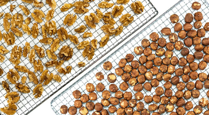 Oluščene orehe in lešnike lahko zložite na pladnje in sušite na 50 stopinj ali manj, 45 stopinj, če je mogoče, in sicer dve do tri ure. V nasprotnem primeru se lahko zamastijo in dobijo neprijeten vonj. Proti koncu sušenja temperaturo dvignite na 75 stopinj za 15 do 20 minut.