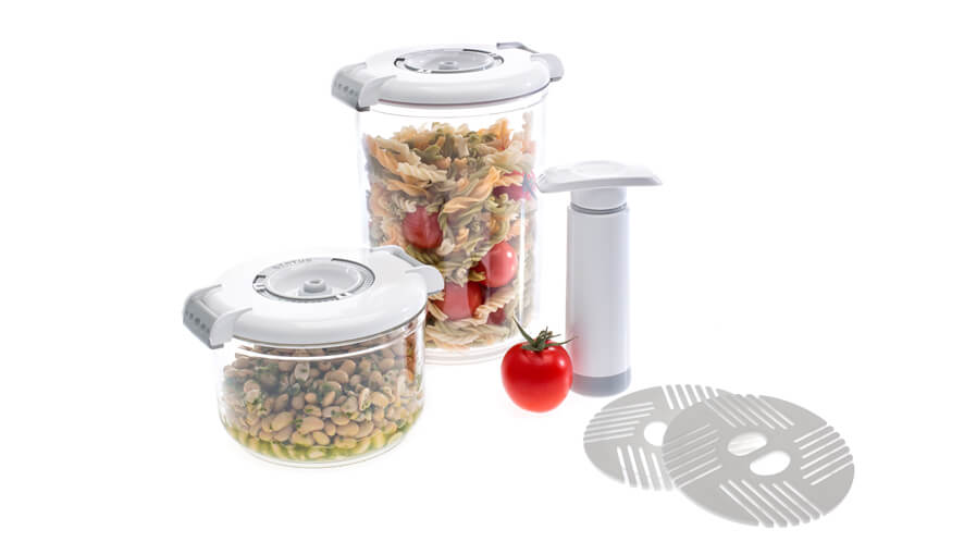 Set okroglih vakuumskih posod je prvenstveno namenjen shranjevanju živil v kuhinjskih omaricah, vendar je dobra izbira tudi za shranjevanje ostankov obrokov ter sadja in zelenjave, ki jim boste z vakuumiranjem podaljšali svežino.