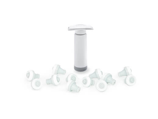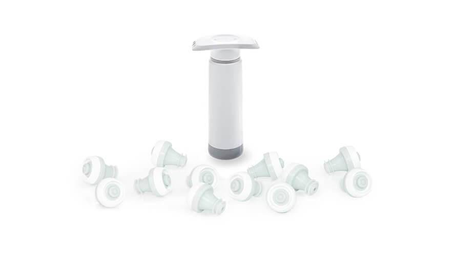 Vse, kar potrebujete za podaljševanje obstojnosti vina, je vključeno v 13-delnem setu: 12 vakuumskih zamaškov in ročna vakuumska črpalka. Uporaba vakuumskih zamaškov je popolnoma enostavna in hitra ter primerna za rdeča, bela in rose vina.