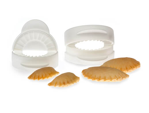 Modelčka za polnjene piškote v dveh dimenzijah (premer 70 in 80 mm) sta namenjena enostavni pripravi žepkov ali raviolov. Z modelčkom izrežite pripravljeno testo, ga napolnite in stisnite – lični marmeladni žepki so pripravljeni z enim pripomočkom. Ne potrebujete več kozarca za rezanje krogov in vilice za zapiranje napolnjenega testa.