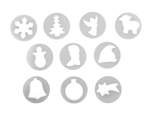 Pripravite najljubše testo za kekse, ga razvaljate in prenesite na ploščo z različnimi oblikami piškotov. Dobili boste kar 23 različni oblik naenkrat, ki bodo že pripravljeni na peko – brez prenašanja posameznih piškotov na pekač, pri čemer jih poškodujete in izgubijo obliko. Uporabite ploščo za oblikovanje, ko rabite veliko piškotov na hitro. Če želite popestriti običajne srčke, lunice in krogce pa uporabite enega od priloženih pripomočkov za okraševanje – pisalo ali črke na odtis.