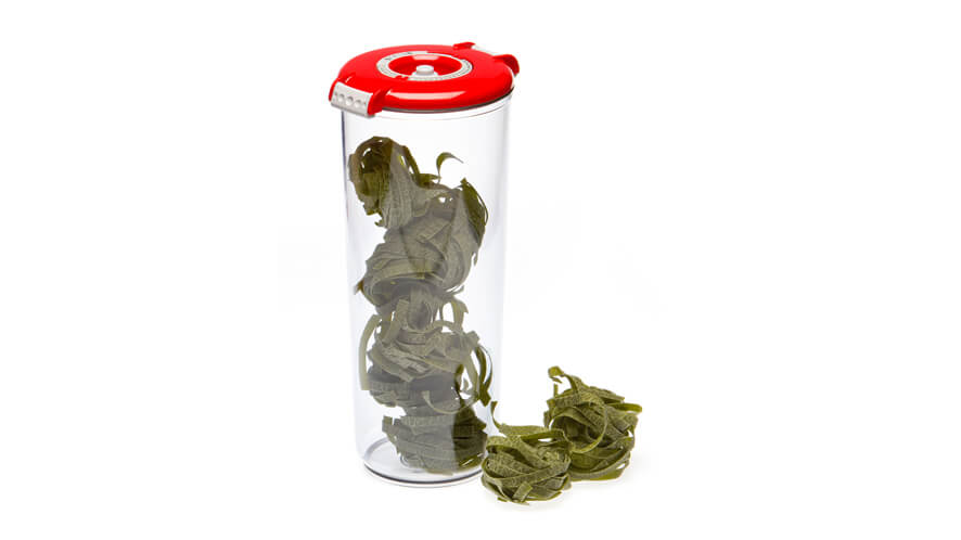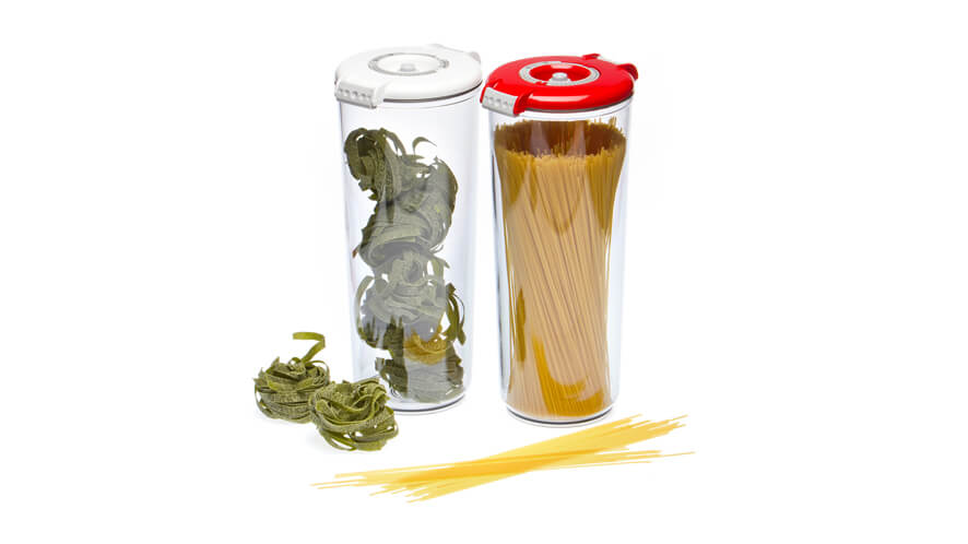 So vaše kuhinjske omarice polne doz za shranjevanje živil najrazličnejših oblik, zato je zaloga živil nepregledna in pogosto zavržete živila s poteklim rokom trajanja? S Statusovimi vakuumskimi posodami boste podaljšali rok trajanja živil in pregledno uredili kuhinjske police. Visoka, okrogla vakuumska posoda je idealna za shranjevanje testenin, mok in žitaric.