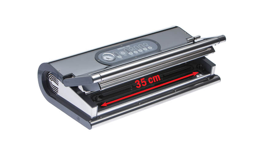 Status Provac ima daljši vakuumski kanal in varilni trak od ostalih aparatov, namesto 28 kar 36 cm. To za vas pomeni, da lahko zavakuumirate cel svinjski kotlet ali celega piščanca v vakuumske vrečke širine 35 cm ali več manjših vrečk hkrati. Tako boste lahko zapakirali tudi po tri suhe salame naenkrat.