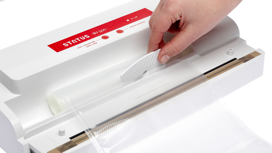 Za lažje izdelovanje vrečk iz folije v roli ima vakuumirka BV500 vgrajen prostor za folijo. Odmerite želeno dolžino vrečke glede na živilo, ki ga boste zavakuumirali in odrežite s priloženim nožkom. Spodnji rob zavarite in vakuumska vrečka je pripravljena za uporabo. Od tukaj je postopek enak kot pri vakuumiranju živil v vrečke. Glede na vrsto živila le izberite primerno nastavite vakuumiranja – ročno ali avtomatsko.
