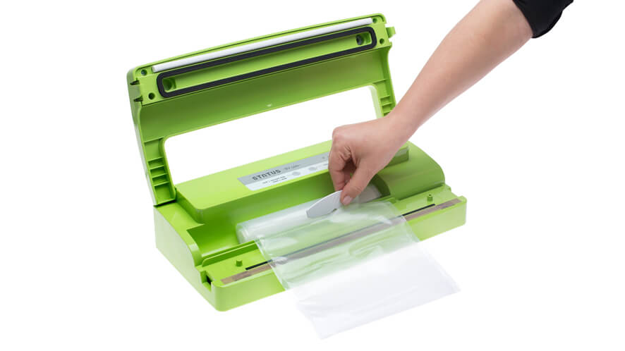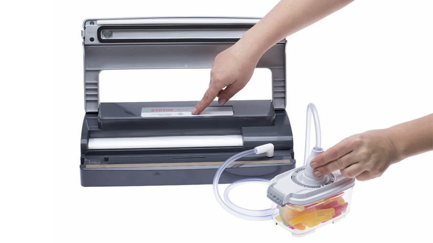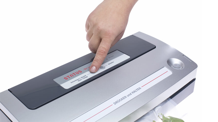 Preprosto, zahteva le kanček pozornosti in dodaten pritisk na gumb. Vrečko z živilom namestite v vakuumski kanal in začnite proces izsesavanja zraka s pritiskom na gumb »Vakuumiranje vrečk«. Spremljajte proces in s pritiskom na tipko »Stop« prekinite vakuumiranje, ko opazite, da tekočina polzi proti aparatu ali ko se oblika živil začne deformirati. Vakuumirka nato vrečko z zavakuumiranimi živili samodejno še zavari. V nekaj poskusih boste postopek ročnega vakuumiranja zagotovo obvladali.