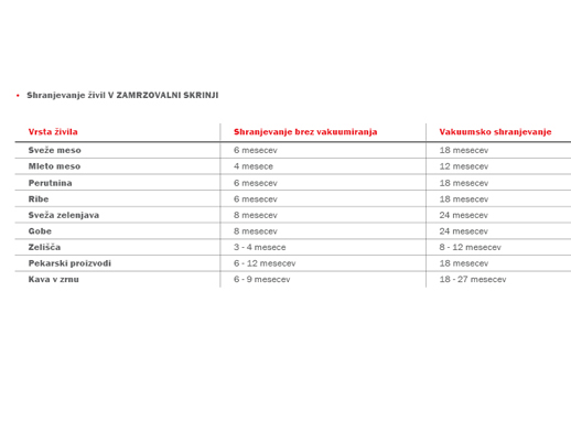 PRIPOROČAMO! Vlažna in mehka živila pred vakuumiranjem zamrznite za 1 do 2 uri na pladnju in jih nato vstavite v vrečke in zavakuumirajte. Tako bodo povsem ohranila svojo obliko in ne bo nevarnosti, da bi tekočina med vakuumiranjem prišla v vakuumski kanal. Če predzamrzovanje ni mogoče, vstavite med živilo in vrh vrečke papirnato brisačo, ki bo med vakuumiranjem vpila preobsežno vlago in sokove. Pazite le, da brisačka ni na mestu varjenja.